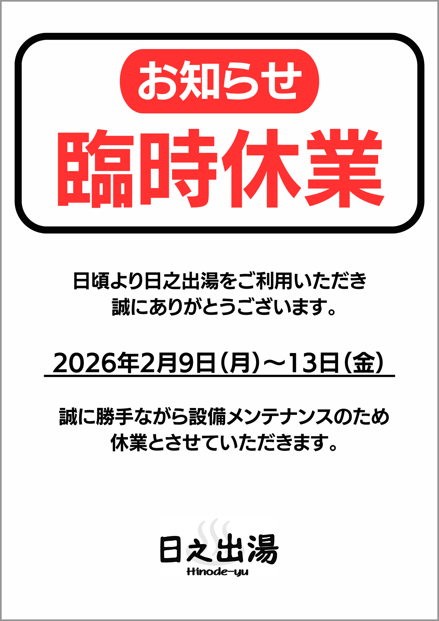 2026年2月9日(月)〜13日(金)の間、誠に勝手ながら設備メンテナンスのため休業とさせていただきます。